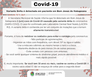 A Secretária Municipal de Saúde informa que foi detectado em Bom Jesus do Itabapoana 1 (um) caso de Covid-19 causado pela variante delta do coronavírus (SARS-COV2).
